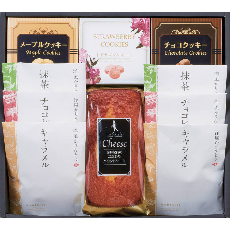 チーズパウンドケーキ:180g×1、洋風かりんとう×6(キャラメル20g・抹茶ラテ20g・チョコレート20g×各2)、イチゴクッキー:30g・メープルクッキー:50g・チョコクッキー:50g×各1